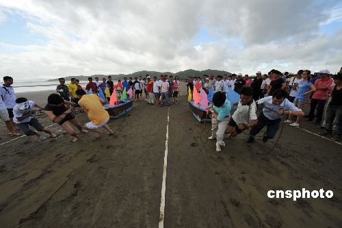 浙江省全民健身浙东片区“种文化”海洋体育活动7月14日在岱山鹿栏晴沙景区上演,来自省内7个地市56个单位的700多名选手在鹿栏晴沙景区参加海洋特色体育项目沙滩运动会,主要项目包括海滩套缆绳、海滩爬船绳、沙滩障碍接力、沙滩迎“新娘”、海上拔河等。中新社发 龙父 摄