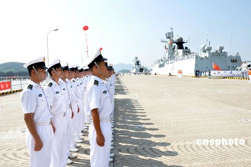 7月16日上午,中国海军第三批护航编队从浙江舟山东海舰队某军港启航,赴亚丁湾、索马里海域接替第二批护航编队执行护航任务,此举标志着中国海军护航行动常态化运行又有了新的发展。第三批护航编队由东海舰队“舟山”号和“徐州”号两艘导弹护卫舰和“千岛湖”号综合补给舰,以及2架舰载直升机和数十名特战人员组成,整个编队800余人。 中新社发 胡善敏 摄