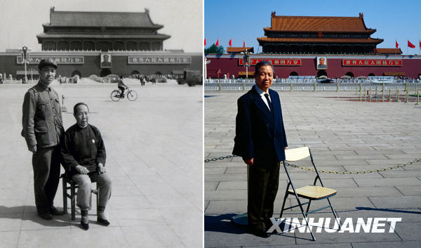 左图为1969年,在部队工作的毛联裕与母亲在天安门广场留影;右图为2009年,已经退休的毛联裕再次在广场留影,母亲已经去世。黑明 摄(黑白照片为资料照片)