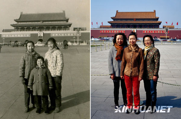 左图为1976年,14岁的刘晖、7岁的李璠和14岁的李璐(由左至右)在天安门前留影;右图为2009年,刘晖、李璠、李璐(由左至右)在天安门前留影,曾留学德国、现在北京开办了一家心理咨询诊所的李璐说:“我和小妹(刘晖)、侄女(李璠)快30年没见面了,因为重拍这张照片,我们再次相聚,心情特别激动”。黑明 摄(黑白照片为资料照片)