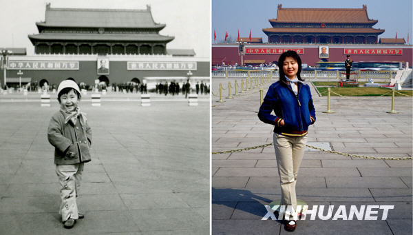 左图为1982年,3岁的王婷婷在天安门广场留影;右图为2009年,王婷婷再次在天安门留影,这年30岁的她在北京经营着自己的一家网店。黑明 摄(黑白照片为资料照片)