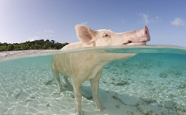 程先生说:“因为当地人老给他们吃的,这些猪一进入水中就会主动游向迎面而来的船只,好像在跟船员们打招呼。在金黄色的沙滩上看到这些猪旁若无人地躺成一片就很奇怪了,没想到他们竟主动与船员们打招呼,更是闻所未闻。”