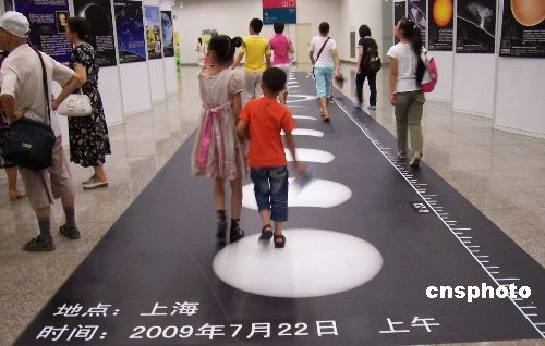 7月15日,“日月魔法——上海迎接2009日全食”科普展在上海科技馆展出吸引观众参观。30块图文并茂的展板生动介绍日全食原理、观测方法等,让观众了解天空奥秘。中新社发 周东潮 摄