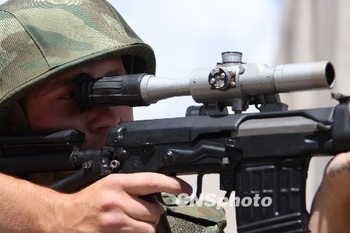 7月21日,参加“和平使命—2009”联合反恐军事演习的俄方参演部队进行分练,中方参演部队予以配合。在80分钟的分练中,进行了 “联合封控、立体突破、机动歼敌、纵深围剿”等内容达到了预期的效果。俄方加强步兵营、空降兵突击连和参演的俄空军各种战机参加了分练。 俄罗斯空降突击连狙击手。中新社发 张雷 摄