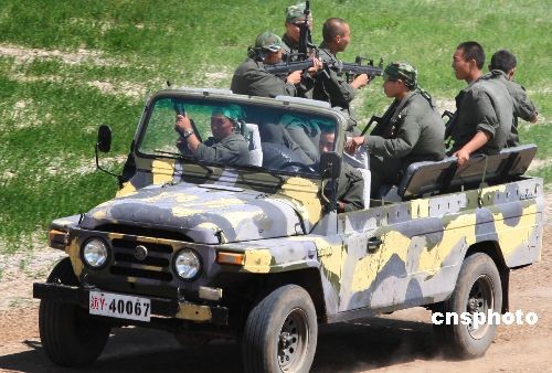 7月21日,参加“和平使命—2009”联合反恐军事演习的俄方参演部队进行分练,中方参演部队予以配合。在80分钟的分练中,进行了 “联合封控、立体突破、机动歼敌、纵深围剿”等内容达到了预期的效果。俄方加强步兵营、空降兵突击连和参演的俄空军各种战机参加了分练。中新社发 宋吉河 摄