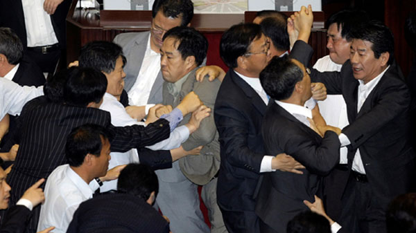 7月22日,韩国首尔,韩国国会民主党议员与大国家党议员发生争斗。