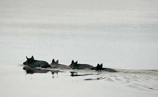 11. 四只野猪在梅利特岛国家野生生物保护区游泳,该自然保护区位于美国佛罗里达中部,附近是肯尼迪航空中心。