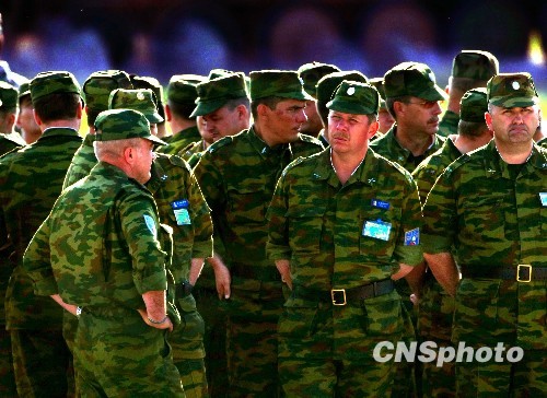 “和平使命2009”联合反恐军事演习将于7月26日上午进入实兵实弹演习高潮,下午举行阅兵仪式。目前俄罗斯参加演习的军人在阅兵地点熟悉现场,这些即将驰骋疆场的官兵露一丝几天来少有的轻松。中新社发 宋吉河 摄