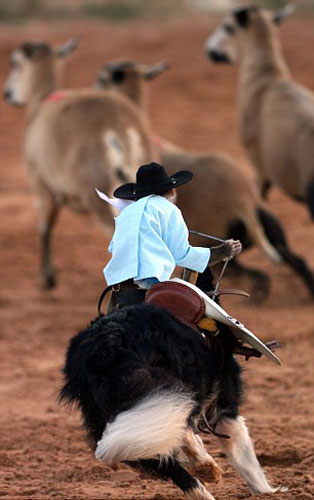 据英国媒体7月25日报道,美国一只猴子以一身西部牛仔打扮,亮相于竞技表演中。与西部牛仔有所不同的是,它的“战马”是一条牧羊犬。这只猴子名气着实不小,演过电视广告,现在还成了网络红星,甚至在一些网站上有自己的主页,浏览人数众多。