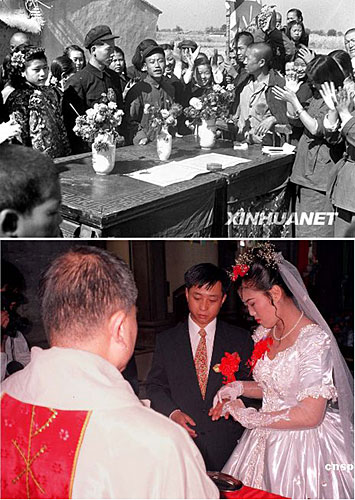 下图:1997年新婚夫妇在济南天主教堂举行婚礼。(图片来源:中新网 李昌玉 摄)