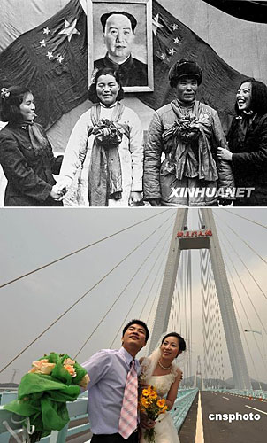 下图:2009年5月21日,浙江舟山16对新人聚集在定海区文化广场举行新居民集体婚礼。(图片来源:中新网 琳红 摄)