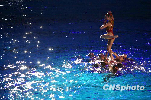 7月27日晚,2009年中俄青少年运动会在北京国家游泳中心“水立方”开幕。本次赛事为期5天,共将进行摔跤、射击、跳水、花样游泳、体操、武术等9个大项、62个小项的比赛。中国和俄罗斯代表团各派出88名青少年运动员参赛。中新社发 富田 摄