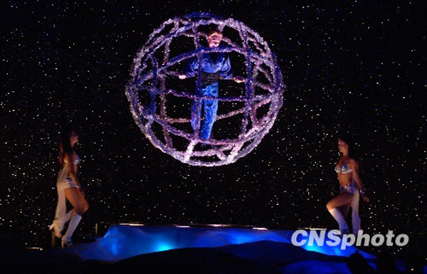7月27日晚,瑞士魔术大师皮特·马韦(Peter Marvey)在2009北京魔术大会首场舞台魔术嘉宾演出的压轴戏中,表演了技巧高超、代表和平友谊气息的《梦幻飞行》魔术节目,博得满堂喝彩。他的飞行魔术技巧同当年大卫·科波菲尔的最佳表演难分仲伯。瑞士人皮特·马韦(Peter Marvey),曾获蒙特卡洛国际魔术比赛《金魔棒》奖和大师级的“莫林奖”。中新社发 邹宪 摄