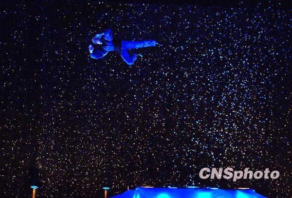 图为在魔术大会上,他轻松自如地在空中飞行。中新社发 邹宪 摄