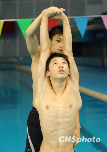 图为中国跳水队队员赛前热身。