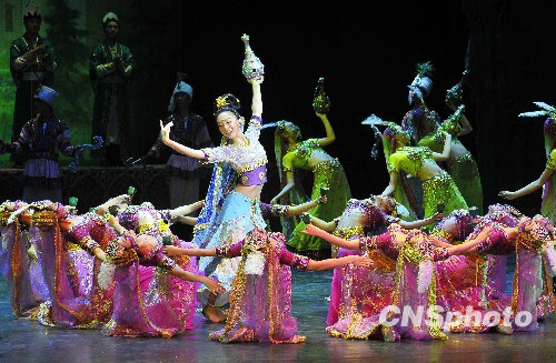 7月29日晚,作为国庆60周年献礼的优秀演出剧目,由中宣部和文化部主办,甘肃省歌舞剧院演出的经典舞剧《丝路花雨》,在国家大剧院上演。中新社发 潘旭临 摄