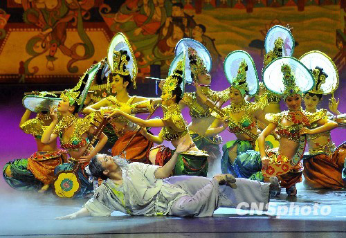 7月29日晚,作为国庆60周年献礼的优秀演出剧目,由中宣部和文化部主办,甘肃省歌舞剧院演出的经典舞剧《丝路花雨》,在国家大剧院上演。中新社发 潘旭临 摄