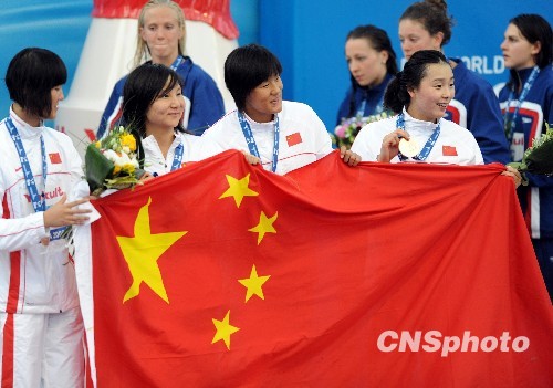 罗马时间7月30日晚上,罗马世锦赛女子4×200自由泳颁奖仪式上,中国夺金选手杨雨、朱倩蔚、刘京、庞佳颖展开国旗欢庆胜利。中新社发 廖攀 摄