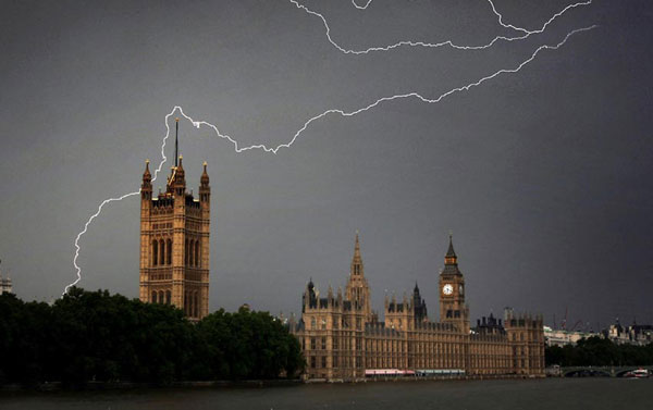 2009年6月27日,暴风云聚集在伦敦上空,闪电在议会附近划过天际。