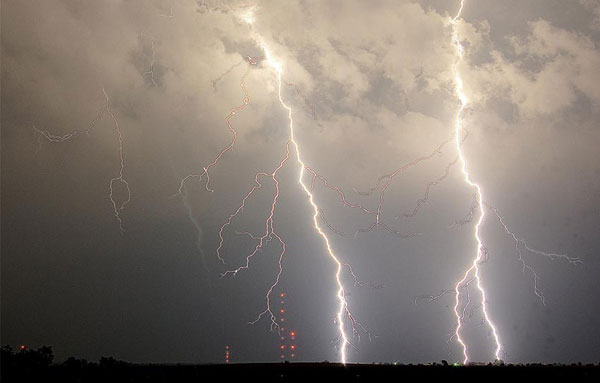 2009年6月16日,闪电与美国堪萨斯州切洛基县地面接触的情景。
