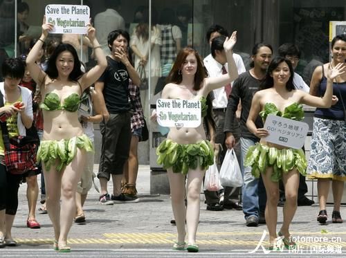 2009年8月3日,日本东京,日本动物保护组织成员在街头举行抗议活动,她们身着由生菜叶子制成的比基尼热辣服装,高举"拯救地球,转到素食”字样的标语在街头宣传。