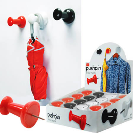 五颜六色的图钉墙钩钉在墙上显得既别致又时尚,除了装扮单调的墙面还可挂衣服和雨伞等。