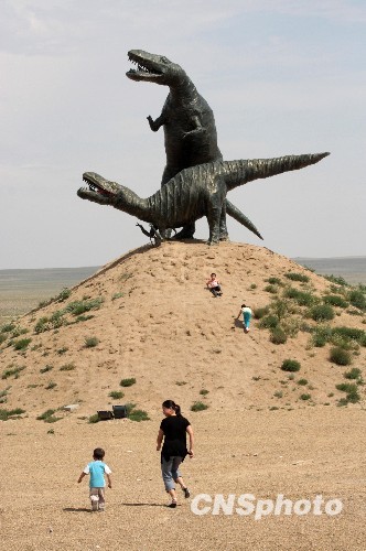 8月5日,游客在内蒙古二连浩特恐龙地质公园观赏恐龙化石和雕塑。二连浩特地区是亚洲最早发现恐龙化石及恐龙蛋化石的地区之一,素有“恐龙之乡”美誉。从19世纪90年代开始,先后有俄、美、加等近10个国家和我国的古生物学家、地质学家在这里进行过大型考察和挖掘,曾陆续发现盘足龙、欧氏阿莱龙、鸭嘴龙、似鸟龙等10余种恐龙化石,出土了大量较完整的恐龙骨骼化石。中新社发 吴芒子 摄