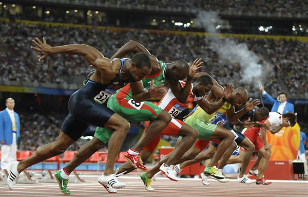 图为在北京奥运会的男子百米飞人大赛预赛中运动员们起跑的瞬间。