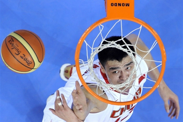 图为在北京奥运会上中国篮球名将“小巨人”姚明在比赛中。