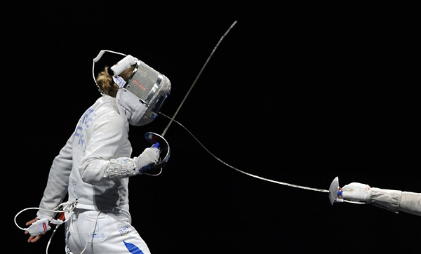 图为在北京奥运会的击剑场上,一名选手中剑的瞬间。
