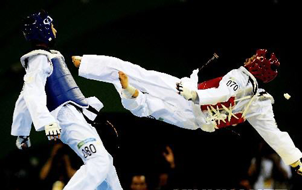 图为在北京奥运会跆拳道比赛场上的精彩一踢。