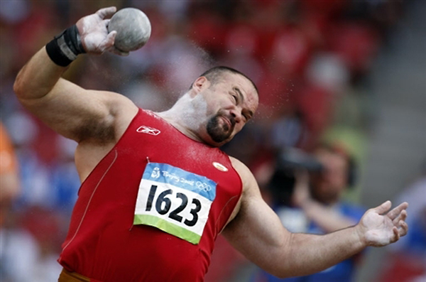 图为在北京奥运会主会场“鸟巢”内,一位选手正在奋力地推出手中的铅球。