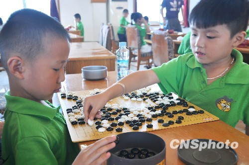 8月8日,两位小朋友正在聚精会神进行围棋对弈。当日,中国首个“全民健身日”江西启动仪式”在南昌举行。主办方考虑到“莫拉克”台风可能影响本市,将棋牌类比赛设在室内体育比赛大厅举行,吸引南昌200余棋牌类选手前来参赛。中新社发 马裕淇 摄