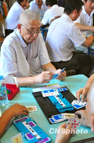 8月8日,一位81岁高龄老者正在聚精会神打桥牌。当日,中国首个“全民健身日”江西启动仪式”在南昌隆重举行。主办方考虑到“莫拉克”台风可能影响本市,将棋牌类比赛设在室内体育比赛大厅举行,吸引南昌200余棋牌类选手前来参赛。中新社发 马裕淇 摄