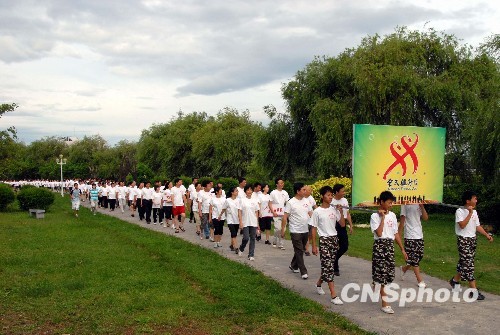 8月8日,尽管台风“莫拉克”逼近福建中北部沿海地区,福建省漳浦县数千民众依然会聚西湖公园广场,绕着西湖公园健步走,迎接中国首个“全民健身日”的到来。中新社发 蓝智伟 摄