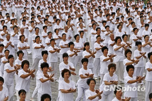 8月8日,汕头市林百欣广场及广场草地,近万汕头市民参加太极拳表演,喜迎第一个“全民健身日”。 中新社发 郭海 摄