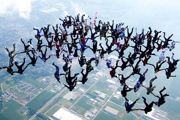 高空跳伞世界纪录:美国上空108名伞降者从1.8万英尺(约5.48公里)高空以180英里每小时时速跳下,并在空中组成各种图形,欲打破世界纪录。
