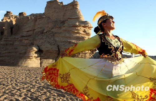 日前,在新疆著名的名胜古迹雅丹地貌(魔鬼城),国际旅游小姐中国新疆赛区总决赛的佳丽身穿晚装和别具特色的古西域民族服饰展示风采。中新社发 钱兴强 摄