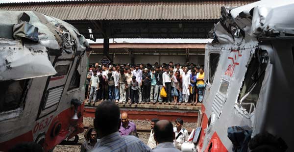 8月9日,在印度孟买一个车站,一辆行驶中的火车撞上了正在站台停靠的另一辆列车,至少造成6人受伤。