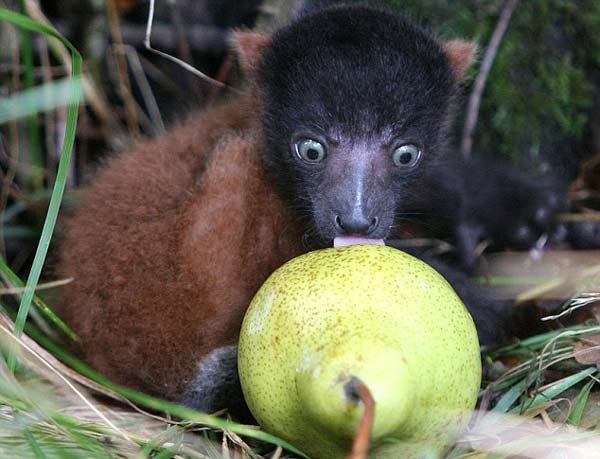 据英国媒体11日报道,苏格兰布莱尔德拉蒙德野生动物园近日诞生了一只可爱的红领狐猴宝宝,当游客向它扔去一个梨时,好奇的狐猴宝宝对梨非常着迷,不停地舔。 小狐猴舔梨的可爱表情吸引许多游客驻足观看。