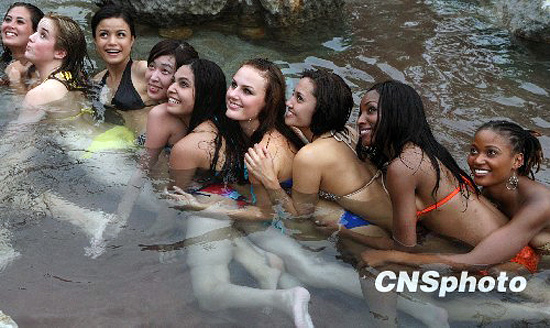 8月12日,正在湖北省参加2009国际旅游小姐冠军总决赛湖北站巡游的各国佳丽来到随州玉龙温泉参观游览。图为各国佳丽泳装展示风采。中新社发 钱兴强 摄