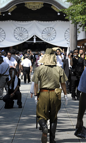8月15日是二战日本投降64周年纪念日,日本约40名跨党派议员参拜靖国神社。其中自民党的两位前首相小泉纯一郎和安倍晋三也在今天参拜了靖国神社。日本右翼分子身着二战时期日军军装为战犯招魂。