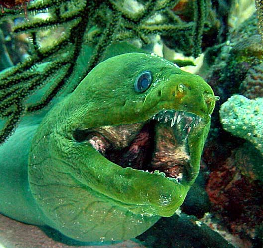 海鳝科是80多种鳗类的统称。分布于热带和亚热带海洋,生活于浅水。它们一般躲藏在礁石的缝隙里,伺机捕食。海鳝有着一张大嘴和锋利的牙齿,它们以海洋生物为食。不过,如果有人类离它们太近,也会遭到它们的攻击。