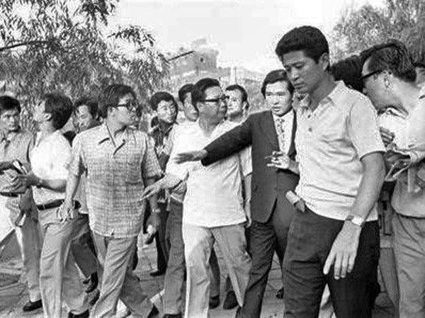 图为1973年8月15日,韩国首尔:在金大中家附近的视察中,金大中告诉特别调查组最高领导人朴宝英他是怎样回到祖国的。图片来源:国际在线