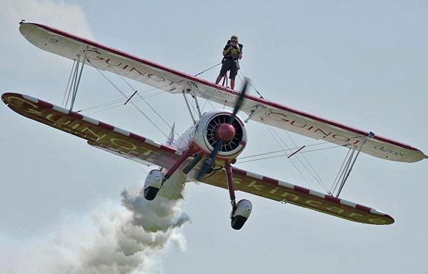 据英国媒体19日报道,在英国格洛斯特郡的一个飞机场,8岁男孩Tiger Brewer站在他爷爷驾驶的飞机机翼上进行了惊险的空中表演,由此成为了世界上最年幼的“机翼行者”。