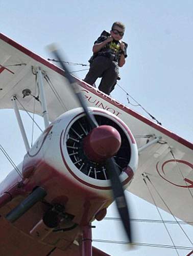 据英国媒体19日报道,在英国格洛斯特郡的一个飞机场,8岁男孩Tiger Brewer站在他爷爷驾驶的飞机机翼上进行了惊险的空中表演,由此成为了世界上最年幼的“机翼行者”。