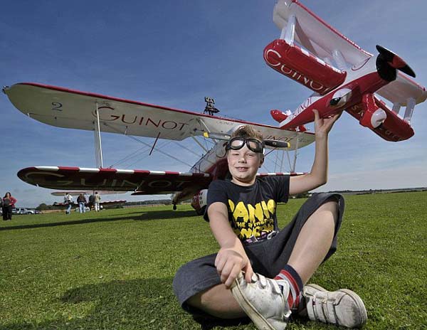 据英国媒体19日报道,在英国格洛斯特郡的一个飞机场,8岁男孩Tiger Brewer站在他爷爷驾驶的飞机机翼上进行了惊险的空中表演,由此成为了世界上最年幼的“机翼行者”。