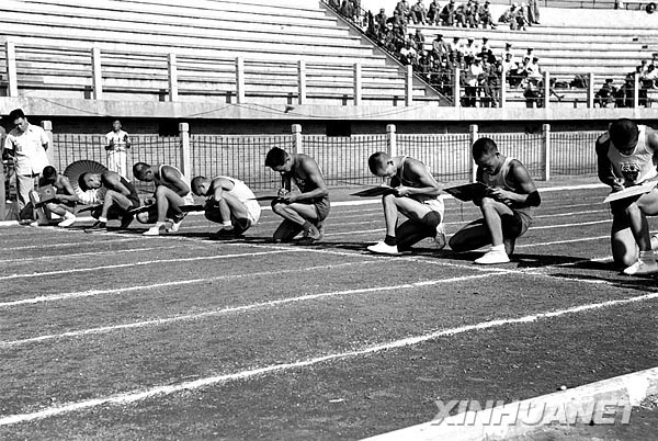 1952年8月2日,庆祝中国人民解放军建军25周年全军运动会在北京举行。图为运动员在进行识字赛跑比赛。(资料图片 岳国芳 摄)
