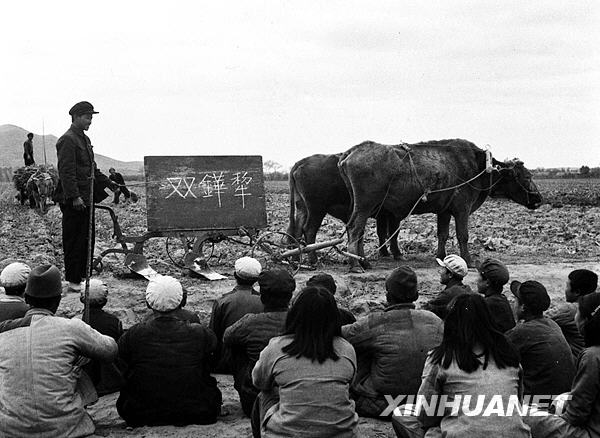 图为1955年,辽宁省复县沙坨村的扫盲班在地里通过实物进行扫盲教学。(资料图片)