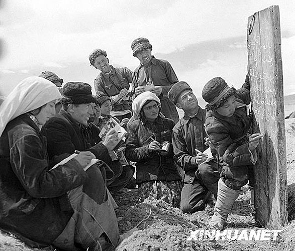 图为1960年,新疆塔什库尔干塔吉克族自治县慕士塔格人民公社二大队的社员在小学生的帮助下在田间学习文化。(资料图片 武纯展 摄)